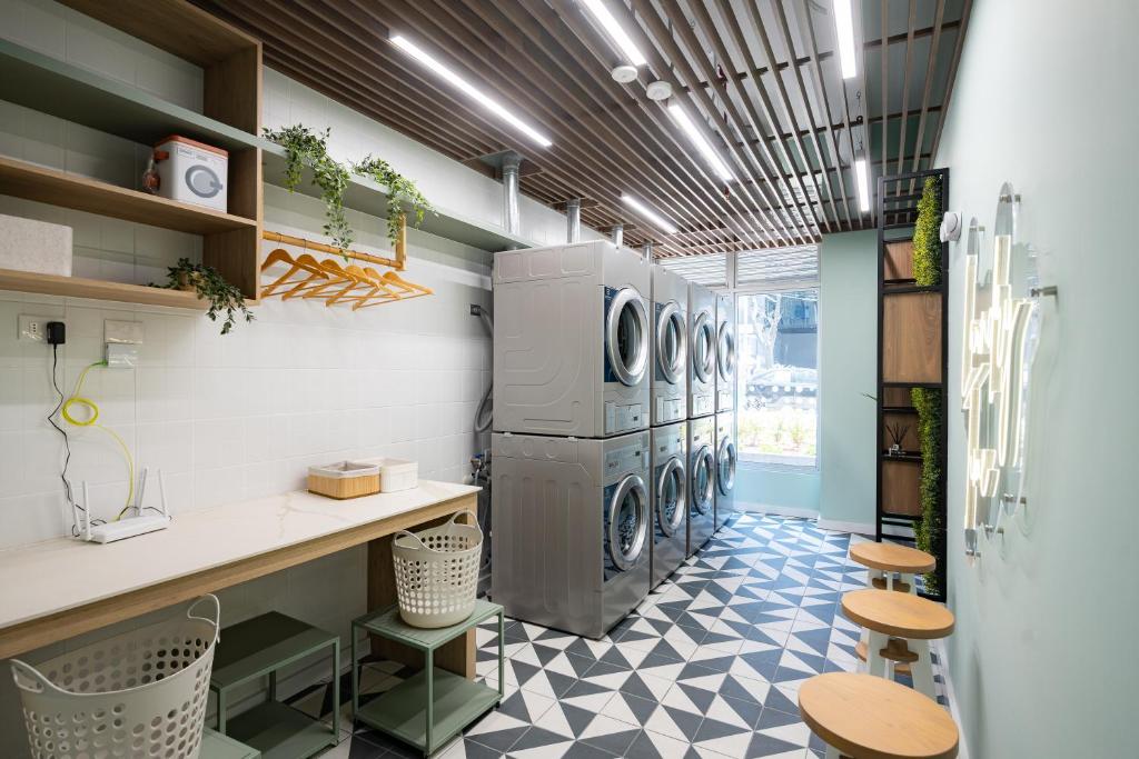 Kitchenette, Refrigerator, Microwave, Dishwasher, Washing machine, Kitchen, Electric kettle, Kitchenware, Dryer, Oven, Cleaning products, Coffee machine, Dining table, Wine glasses