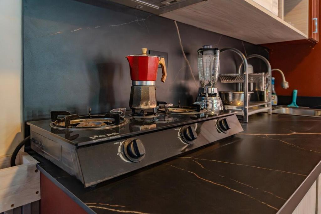 Refrigerator, Microwave, Kitchen, Kitchenware, Stovetop, Coffee machine, Dining table, Wine glasses